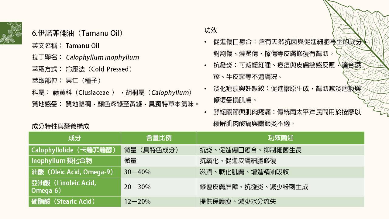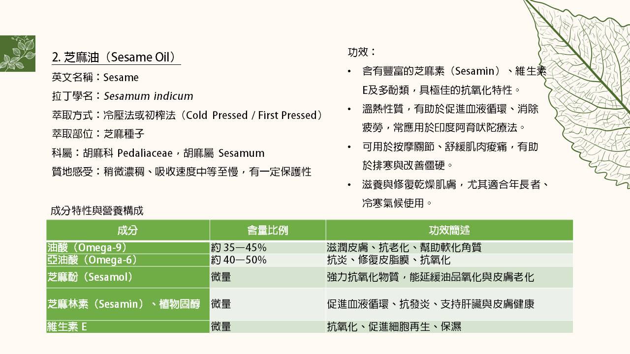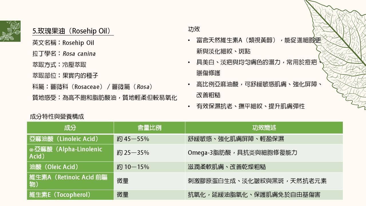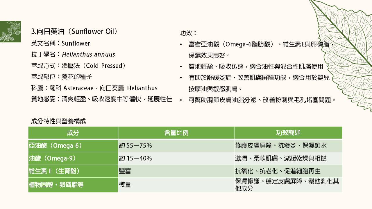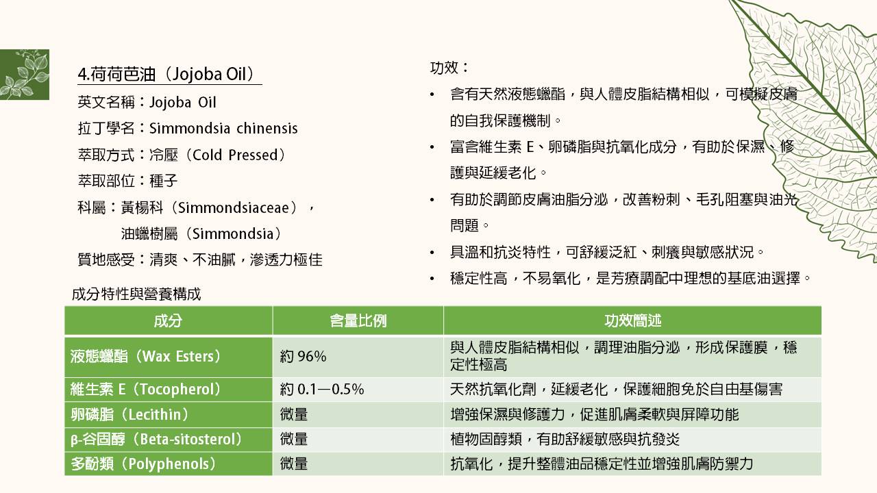 同時也因為自由基含量比較低,因此油質的穩定性也比較高,不同的植物油對應不同的膚質問題,都有它自己的特殊的效果